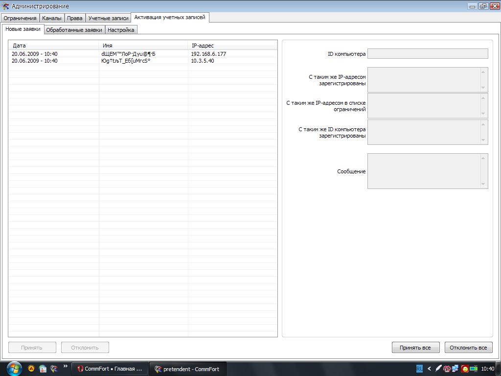 Был у меня открыт один CommFort. Запускаю ещё один (оба 4.30 beta 2). Он запрашивает имя, я нажимаю на ник. Снизу, естественно уже 2 чата. Появляется ещё что-то с надписью CommFort 4.30 beta 2. Я на него переключаюсь, входит в чат, который я вторым открыл. Но икнка второго чата работала вполне нормально. Принажатии на иконку с CommFort 4.30 beta 2, потом закрыть, и мне выбило, что программа не отвечает. Закрыть программу, и второй чат закрылся.