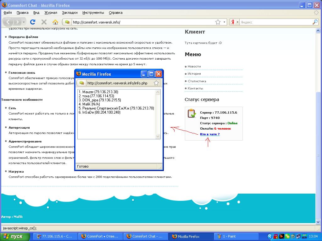 ты можешь только на сайте сделать работает чат или нет, это делается путём пинга определённого портаMafik писал(а):У меня ваще чет неработает , а есть просто скрипт на php чтоб в сайт вставить и все ?
