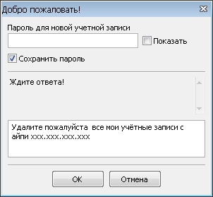 •NormaBot• писал(а):Пароли надо ставить такие чтобы их помнить.В общем создаёшь новую учётку.Потом там в сообщении пишешь чтобы удалили все твои учётки с такого то айпи.Ну или просто перечисли учётки.Модератор его получит и удалит.А потом создай заново. :D