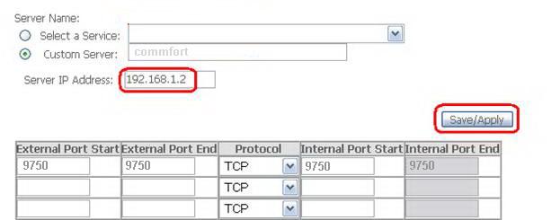Выбери Custom Server и в поле рядом введи имя сервиса - например Commfort и свой IP адрес сетевой карты относительно модема (192.168.1.2 например). Потом пропиши порты - 9750