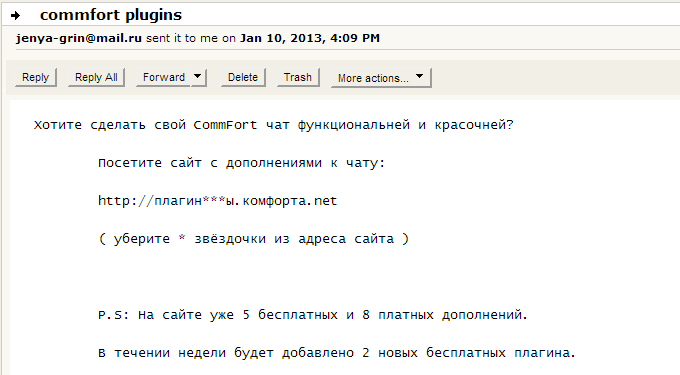 [удалено модератором - офтопик]я тоже получил рассылку, и связь моего адреса с коммфортом кроме как на этом форуме - больше нигде в инете не прослеживается (уже и тут нет, спрятал адрес, раз такие танцы), так что [удалено модератором] ещё и нагло врёт что "пару" и что взяло адреса в интернете. в газенваген его!