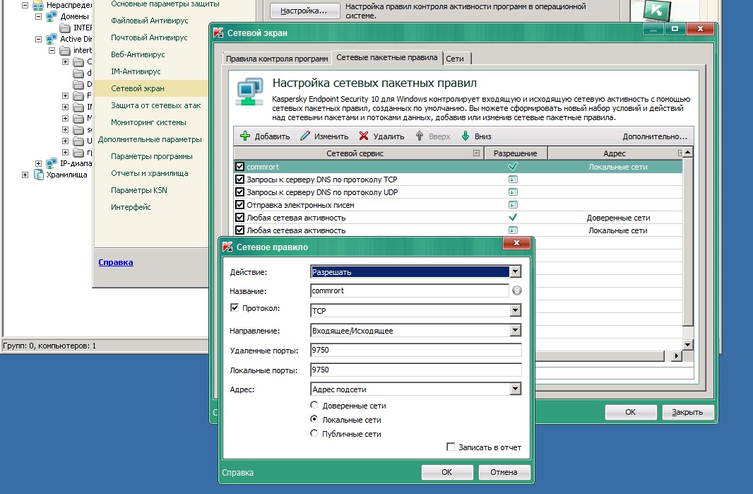 пытался разрешить в сетевом экране порты комфорта, но ничего не получилось. в настройках комфорта указаны порты для передачи данных 30700 и 31700, публикация этих портов в каспере ничего не дает.