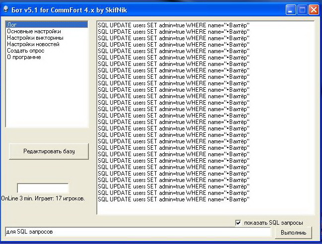 В админском канале бот реагирует только на админа (админ на сервере комфорт и админ бота - разные вещи)ЯROSLOVE писал(а):Красота! Всё работает, новости уходят в приват, бот не виснет. Только вот с админским каналом непонятки. Он же ведь должен работать для админов на любой машине, а у меня только на той, где бот стоит.