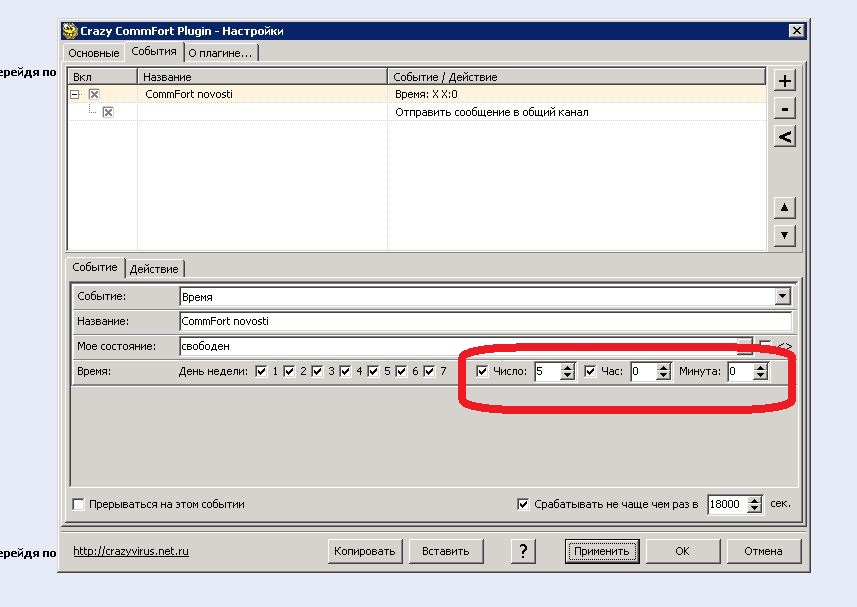 На событие "Время" эта галка не действует. Укажи час в настройках.Chudik писал(а):Поставил галочку на "Срабатывать не чаще чем" и выставил интервал в 18000 сек., пишет всё равно в каналы каждый час. Как можно исправить?