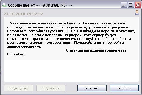 я к ним зашёл после неоднократного спама - читаю приветствие, что то типо за спам мы баним на срок до 7 дней чтоли ... я поржал, дальше пишу им - люди, что за нахер, вы достали уже ... они на меня глазки выпиляли и типо мы не при делах (админы чата писали) говорят типо пользователи видать шалят (а хотя у админа ник как раз под которым и присылалось одно из сообщений спама), потом пока я там с ними вёл беседу, мне в их чате уже пришло парочка сообщений со спамом ))) я опять поржал и в конце концов послав их вышел из их чата...Maxim Mirgorodsky писал(а):commforts.sytes.net:80 исключили из списка серверов за спам.