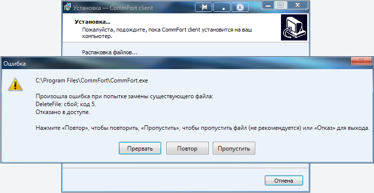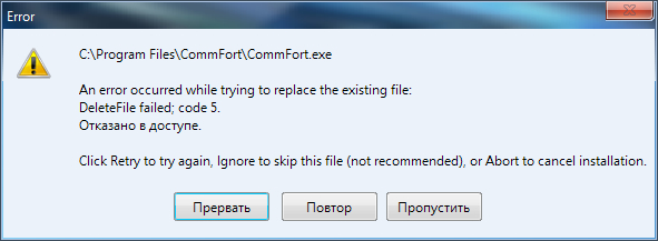 Всем остальным, у кого при установке требует нажать "Повтор" чтобы заменить CommFort.exe - для этого выделим отдельную тему.