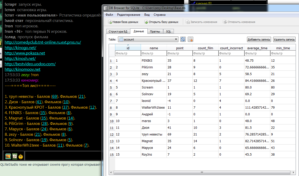 База данных со статистикой и настройками находится по следующему адресу: %ProgramData%\CommFort_server\PluginsData\Видео Викторина\Base.db