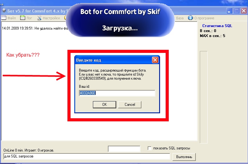 пишешь в аську Skifу, договариваешься за цену, платишь, он тебе ключик дает, вводишь и прощай окно. (вариант два - нажать отмена и бот будет работать в демо версии)viktor6 писал(а):Ребята как убрать это окно ато автозагрузка не работает??