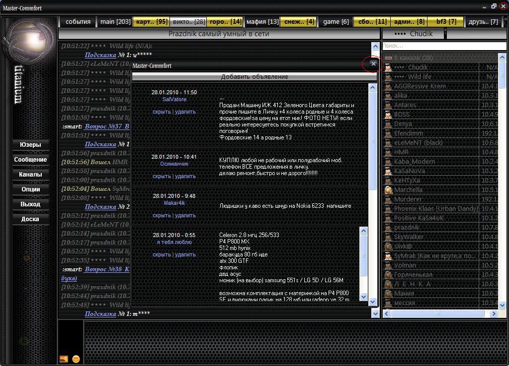YOKOHAMA писал(а):Не понравился клиент начиная с 4.40, то что из самого чата можно просматривать логи, хотелось бы отключать/включать эту функцию в настройках, переименован канал events на канал события, при входе/выходе пользователя в чат пишет "Вошёл .../Вышел ..." бывает что даже не видно это. И продолжаю пользоваться клиентом 4.30 на мой взгляд он самый лучший из всех :)