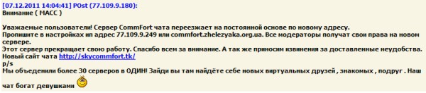 Внимание ( МАСС ) Уважаемые пользователи! Сервер CommFort чата переезжает на постоянной основе по новому адресу. Пропишите в настройках ип адрес 77.109.9.249 или commfort.zhelezyaka.org.ua. Все модераторы получат свои права на новом сервере. Этот сервер прекращает свою работу. Спасибо всем за внимание. А так же приносим извинения за доставленные неудобства. Новый сайт чата http://skycommfort.tk/ p/s Мы объеденили более 10 серверов в ОДИН! Зайди вы там найдёте себе новых виртуальных друзей , знакомых , подруг . Наш чат богат девушками :) ЗАЙДИ И ТЕБЕ ПОНРАВ. уверяю!!!!!!! У нас сидят пользователи из многих стран , городов и сёл . КАЖДЫЙ ПОЛЬЗОВАТЕЛЬ может получить права модератора своей каналы и если канал будет популярный то в дальнейшем администратора чата . Проверка регистраци ника в чате 5 минут . с ув. Администрация
