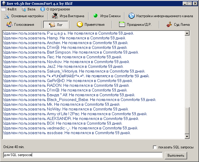 2) возможно используете старую базу игры, записи которой сделаны давно вот он и чиститYaroslav писал(а): 2) Бот работает меньше суток, но лог изобилует сообщениями вроде:В "Основных настройках" параметр "Автоматически удалять из базы..." стоит цифра 30Удален пользователь Army of Life ! 2Pac. Не появлялся в Commforte 59 дней.