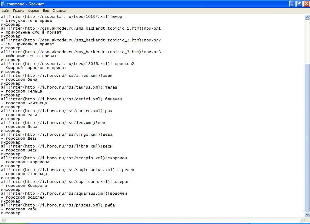 Редактировать надо не в файле, а в базе. Это на закладке «настройки информационного канала» кнопка «команды». Откроется табличка и там всё можно поправить.Chudik писал(а):Что-то не могу понять что яне так делаю,может кто подскажет:)