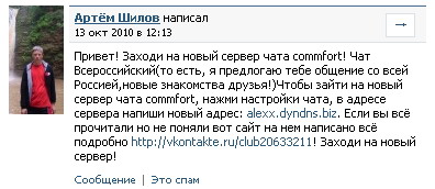 А если чат не чисто по городу, а скажем для страны как в нашем случае мы объединяем разные города но в основном одного провайдера.зёзя писал(а):я не переживаю)))) и что толку от этого спама ну зашли кинули рекламу, и кто пойдёт с своего чата в другой в чужой город? Это уже проверено я например сидеть не буду в чужом городе а если даже ктото и захочет кудато зайти из затеров он и зайдёт и без рикламы в се чаты выложеные тут http://www.commfort.com/ru/online_servers.shtml
