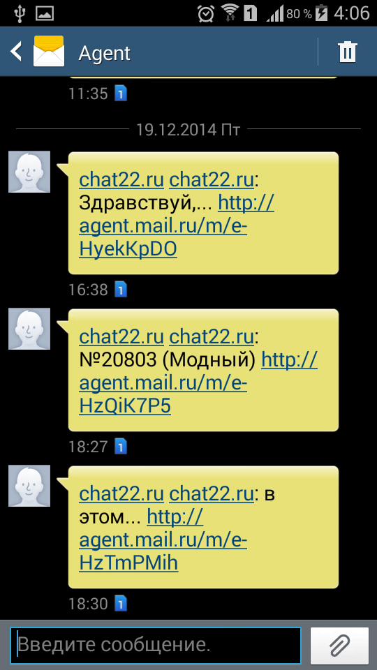а теперь приходит от абонента (Agent) вида "chat22.ru chat22.ru: текст сообще.... http://agent.mail.ru/m/fgfjkgjkbv", т.е. ненужный текст в начале, неполное сообщение и ненужная ссылка для прочтения всего сообщения в браузере.