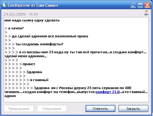 спамеры одолели просто , каждый день это дебила приходят и по личкам заваливают свою рекламу, неужели такие тупые что надеютсю таким методом раскрутить свой чат, да всё равно никто не пойдёт на другие сервера других городов, нет смысла в этом!!!! надо что то делать с этим , а всё из за этих пиратских серверов, я уверен что никто из лицензионщиков таким маиться не будет!!! валить надо такие сервера чтобы нечего им была рекламить!