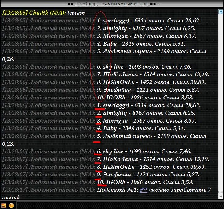 [19:47:44] bot: nfinity отгадал и получает 2 очков.